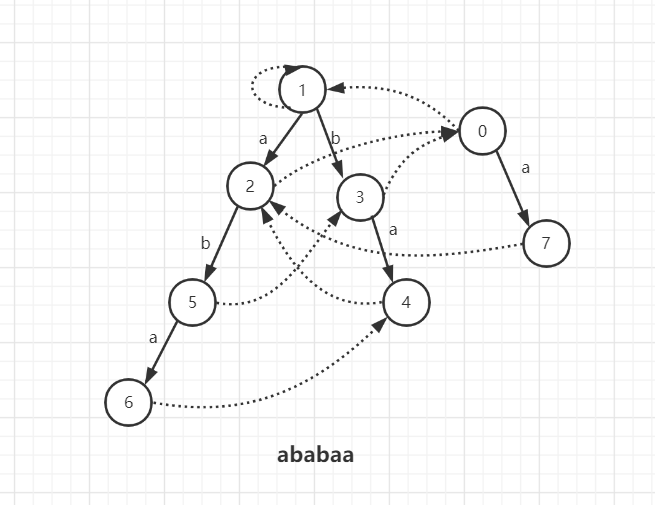 类似于AC自动机,PAM也有fail边,某个结点a的fail边指向的结点b所表达的回文串,是结点a的最长的回文串后缀(如回文串ababa,它有两个回文串后缀aba和a,aba是最长的)。特殊的,0根的fail边指向1根,1根也指向1根(其实1的fail边无所谓,不同的板子可能会不一样)。