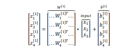 若上一层的激活值为一个(x, 1)的矩阵,本层有m个神经单元,那么本层的每个神经单元的W(特征权重)也是一个(x, 1)的矩阵,b是一个(1, 1)的矩阵,最终计算得到z是一个(1, 1)的矩阵。那么把这些神经单元堆叠起来一起计算,本层的W就是一个(m, x)的矩阵(先把每个神经单元的W倒置,在纵向堆叠),b就是一个(m, 1)的矩阵,最终得到(m, 1)的矩阵为输出结果。